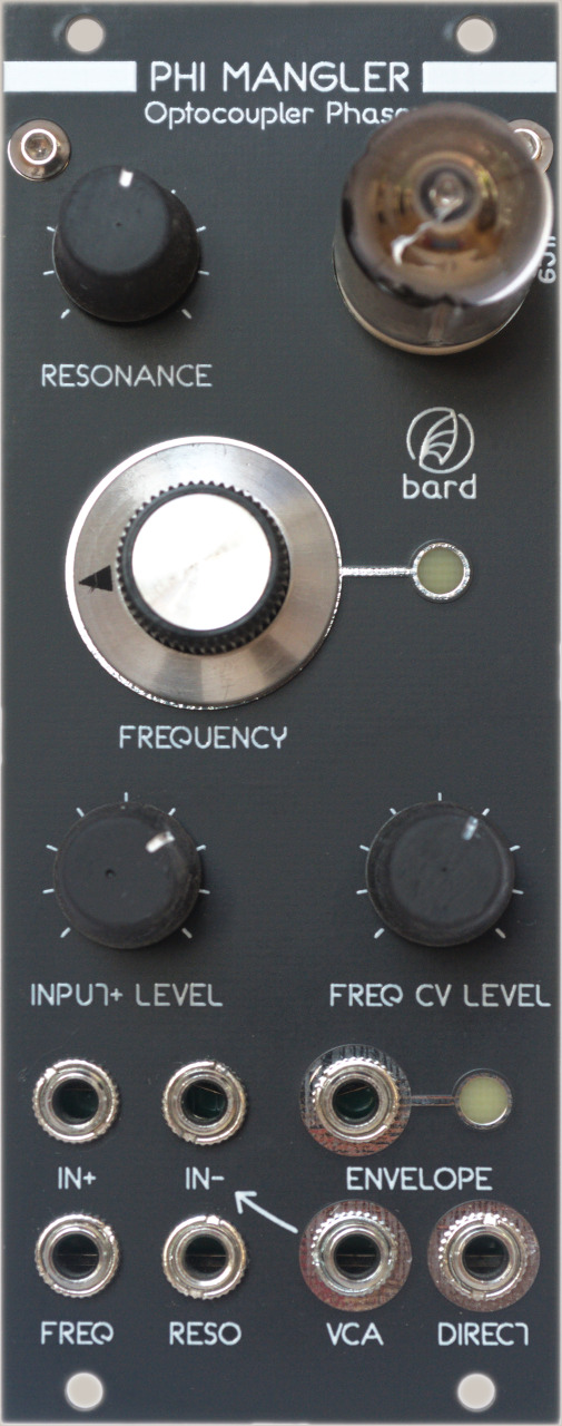 Besides being a phaser, Phi Mangler can be used as a vacuum tube VCA channel. Autogain feature provides limiting to the VCA signal that can decrease dynamic range and create another dimension for saturated feedback oscillation sounds. Send-return of the feedback signal is possible! Since both frequency and resonance can be controlled by control voltages, it is easy to imagine drum sounds and complex waveforms being produced by the unit. On top of all of that, Phi Mangler can be used as a envelope follower which is internally incorporated in Autogain functionality. It can be patched back to frequency control to create "Envelope Filter" effect.